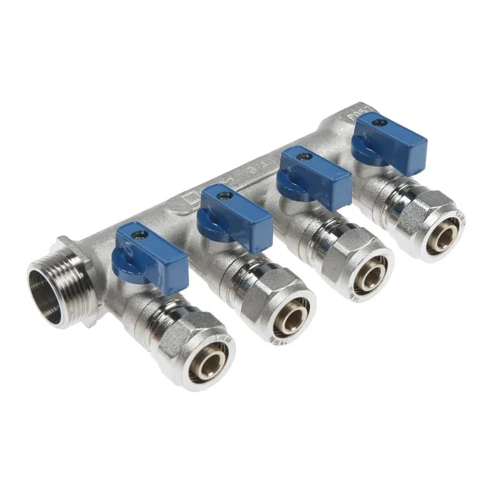 Коллектор «СТМ», 3/4"х16 мм, 4 выхода, с шаровыми кранами, для м/п труб, никелированный