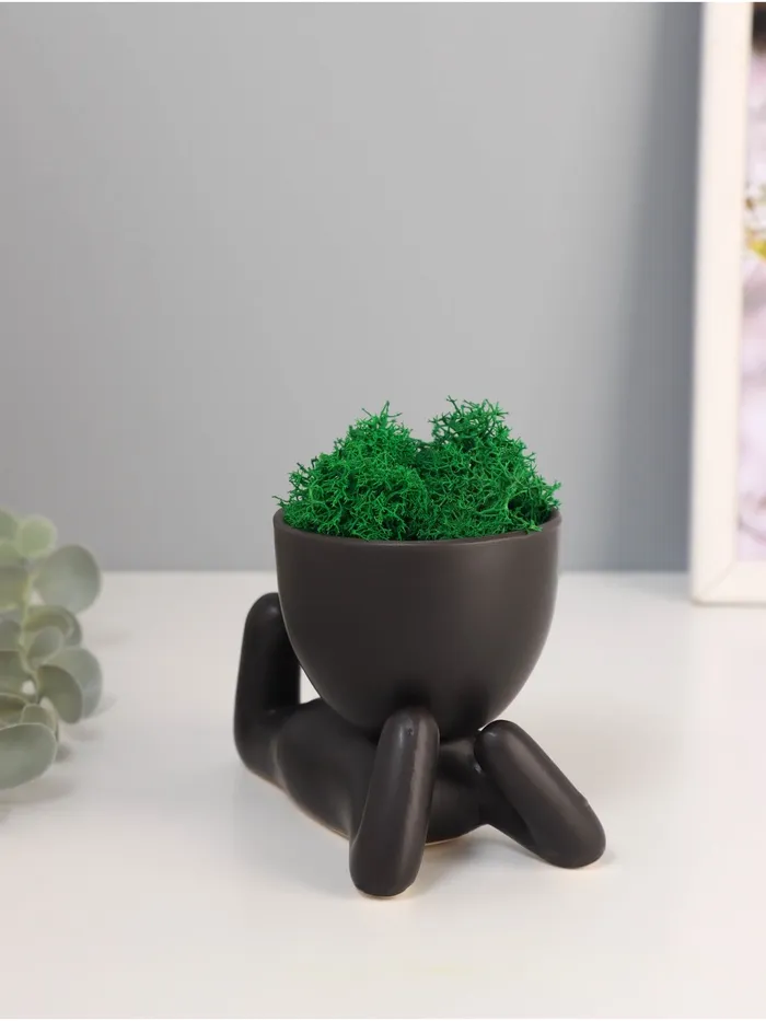 Стабилизированный мох в кашпо из керамики «Мистер Грин йог», 11.5×7×8 см, чёрный