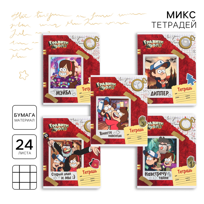 Тетрадь в клетку 24 листа, 5 видов МИКС, частичный уф-лак, обложка мелованный картон, «Гравити Фолз»