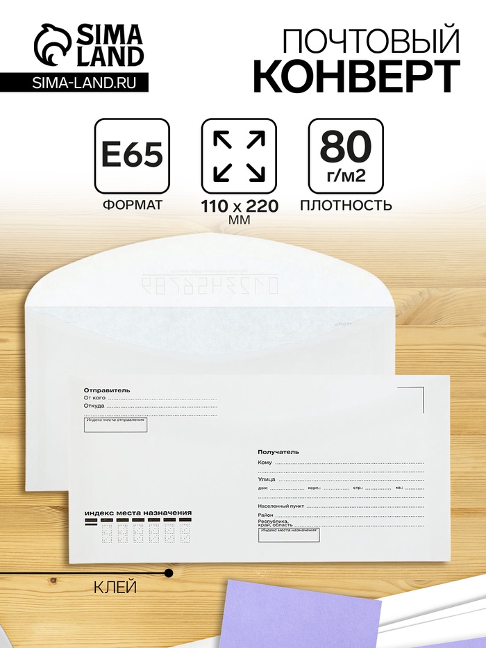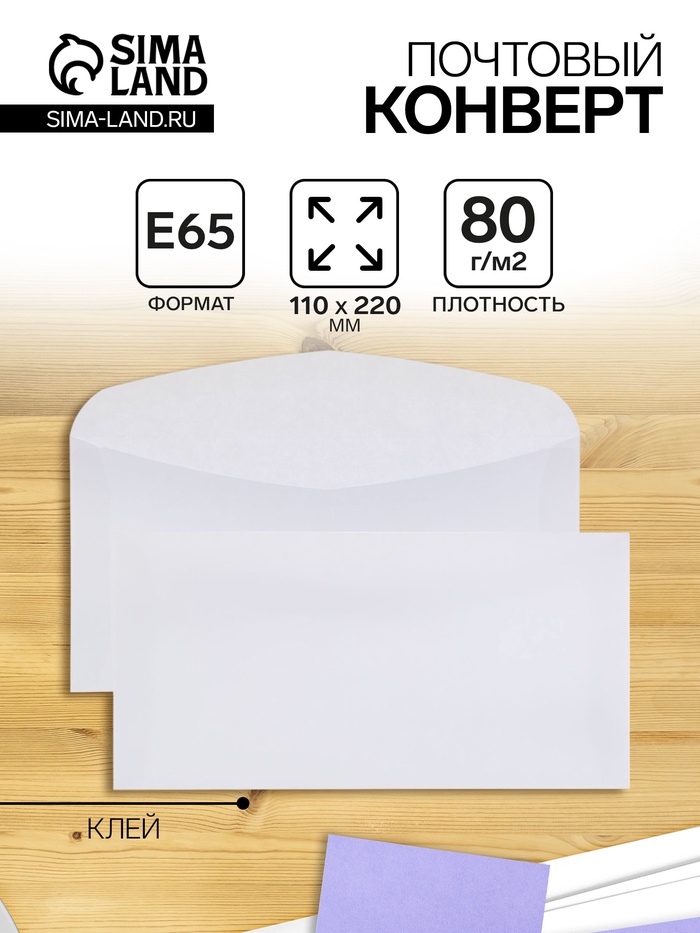 Конверт почтовый E65 110 х 220 мм, без подсказа, без окна, клей, 80 г/м2