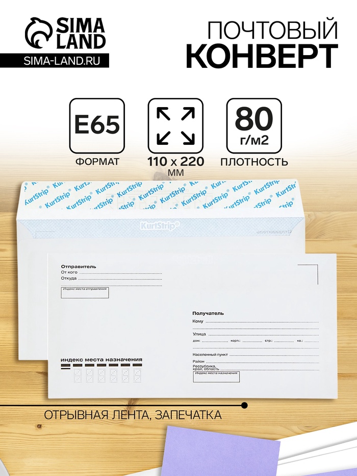 Конверт почтовый Е65 110 х 220 мм, поле "Кому-куда", без окна, отрывная лента, внутренняя запечатка, 80 г/м2