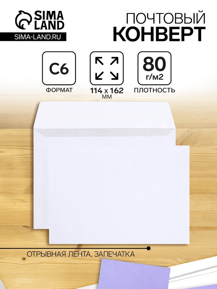 Конверт почтовый С6 114 х 162 мм, без подсказа, без окна, отрывная лента, внутренняя запечатка, 80г/м