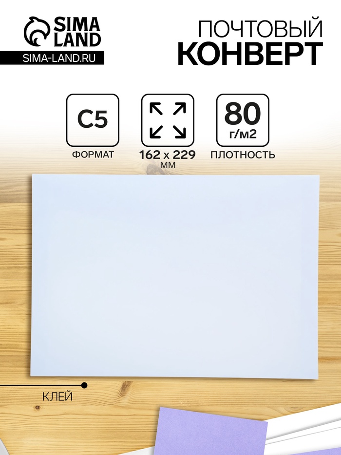 Конверт почтовый С5 162 х 229 мм, без подсказа, без окна, клей, клапан-автомат, 80 г/м2