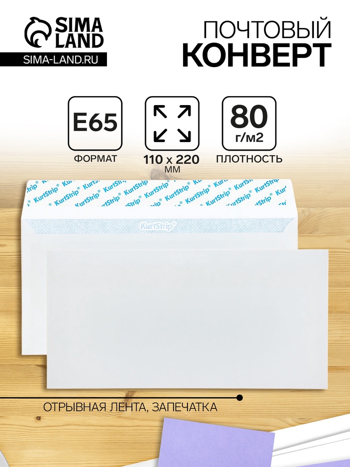 Конверт почтовый Е65 110 х 220 мм, без подсказа, без окна, отрывная лента, внутренняя запечатка, 80 г/м2