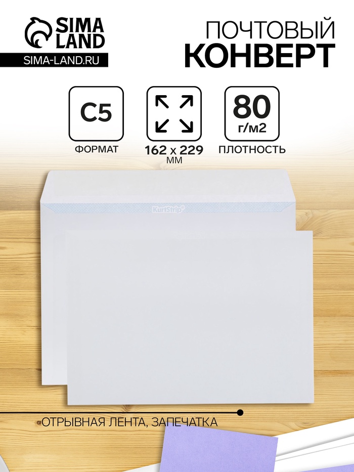 Конверт почтовый С5 162 х 229 мм, без подсказа, без окна, отрывная лента, внутренняя запечатка, 80 г/м2