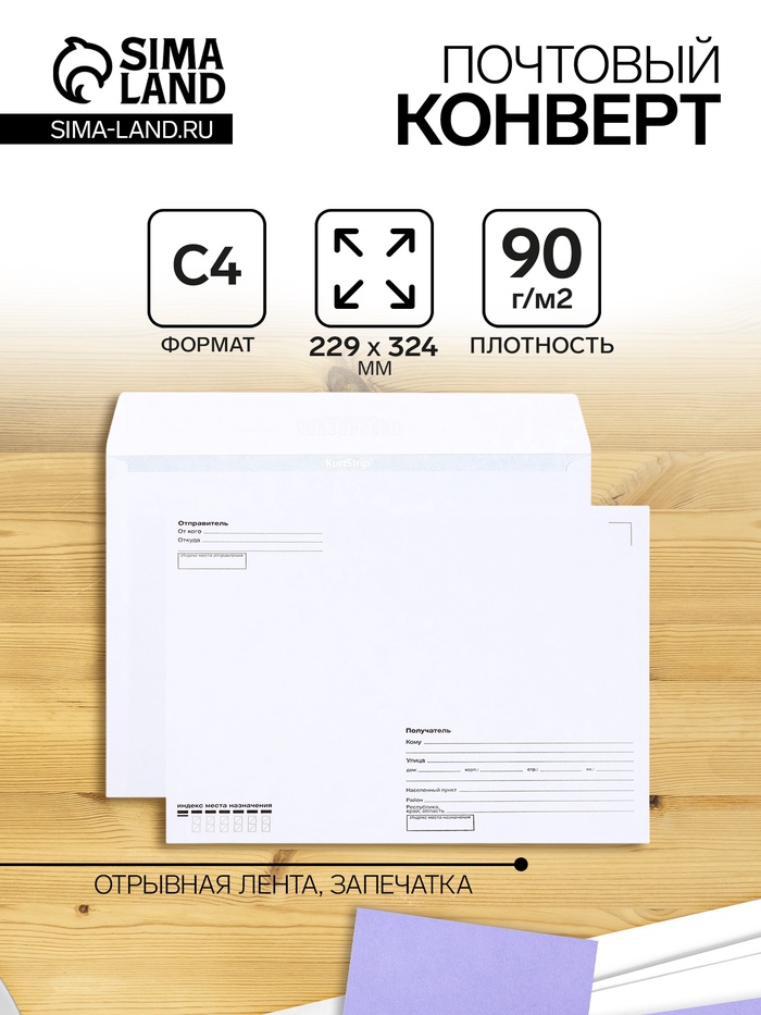 Конверт почтовый С4 229 х 324 мм, поле "Кому-куда", без окна, отрывная лента, внутренняя запечатка, 90 г/м2