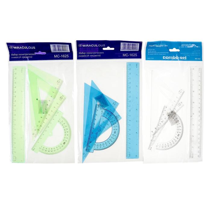 Набор чертежный, прозрачный, на блистере, 4 предмета (линейка 20 см, 2 угольника, транспортир), МИКС