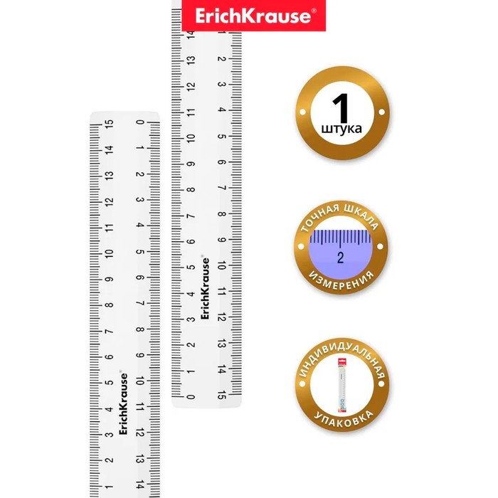Линейка 15 см ErichKrause "Clear", пластик, двусторонняя шкала, прозрачная, европодвес