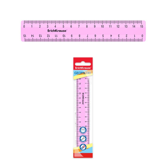 Линейка 15 см ErichKrause "Pastel", пластик, двусторонняя шкала, непрозрачная, розовая, европодвес
