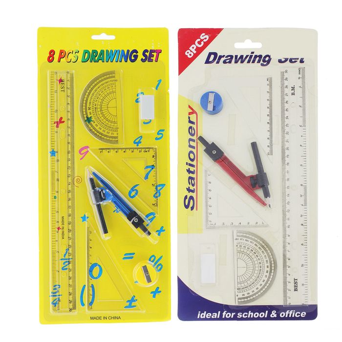 Набор геометрический: линейка 30 см, 2 угольника, транспортир, точилка, ластик, циркуль