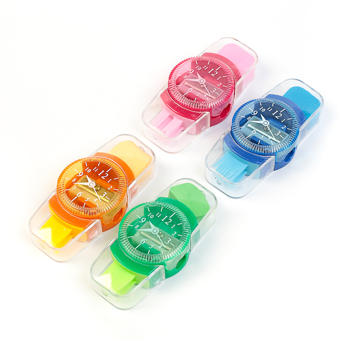 Точилка с контейнером «Часы», с ластиком и щеткой, МИКС