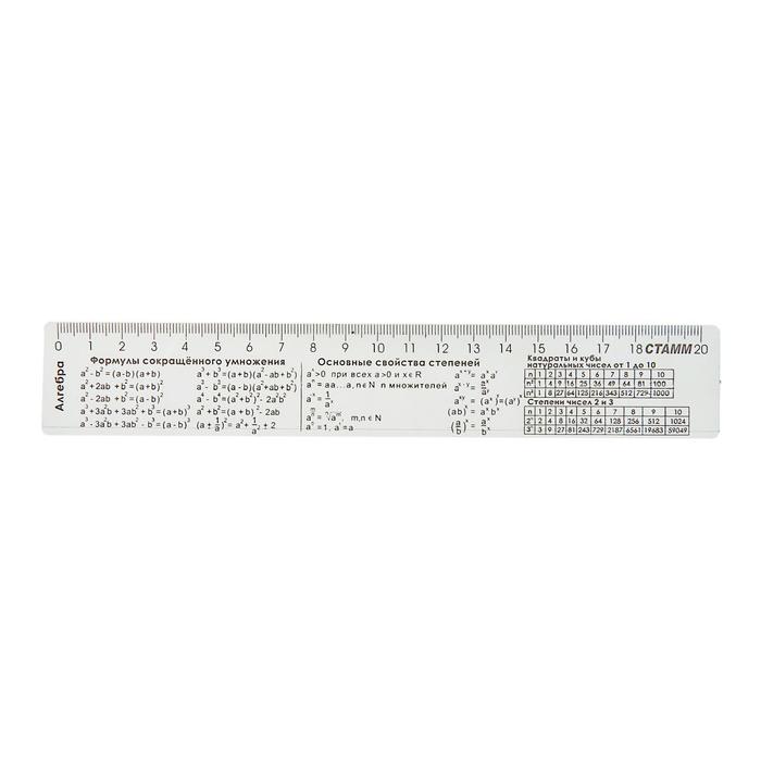 Линейка 20 см Стамм "Алгебра", со справочным материалом, пластиковая, прозрачная, бесцветная