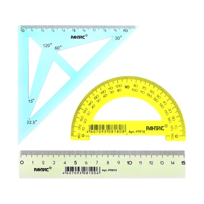 Набор чертёжный «РАНТИС», малый (линейка 15 см, транспортир 10 см, треугольник-трафарет)