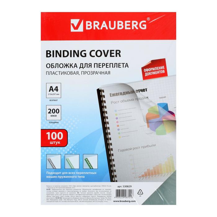 Обложки для переплета A4, 200 мкм, 100 листов, пластиковые, прозрачные бесцветные, BRAUBERG
