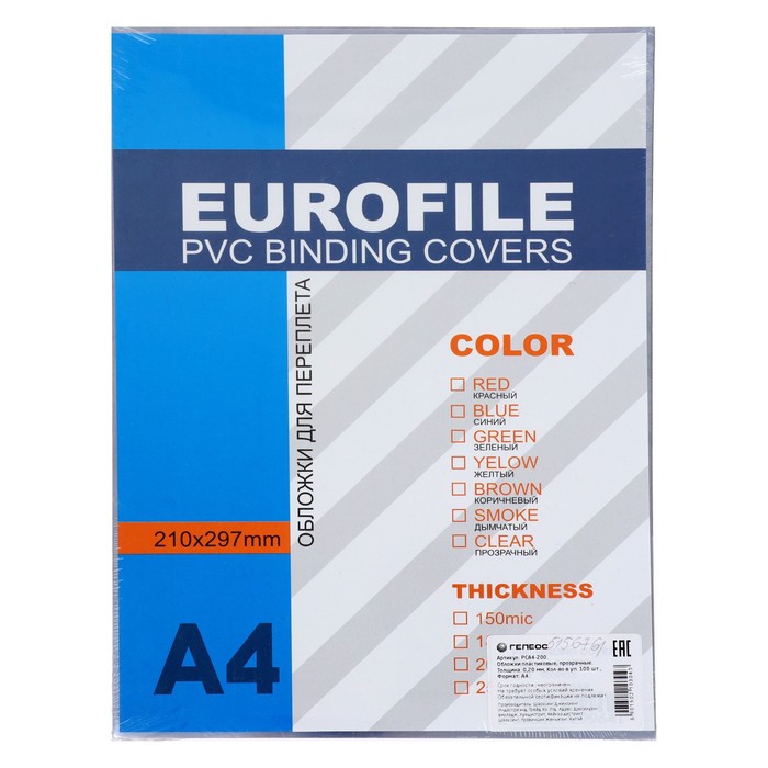 Обложки для переплета A4, 150 мкм, 100 листов, пластиковые, прозрачные бесцветные, Гелеос