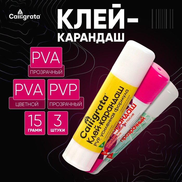 Клей-карандаш, 15 грамм, набор 3 штуки (PVP, PVA,PVA цветной)