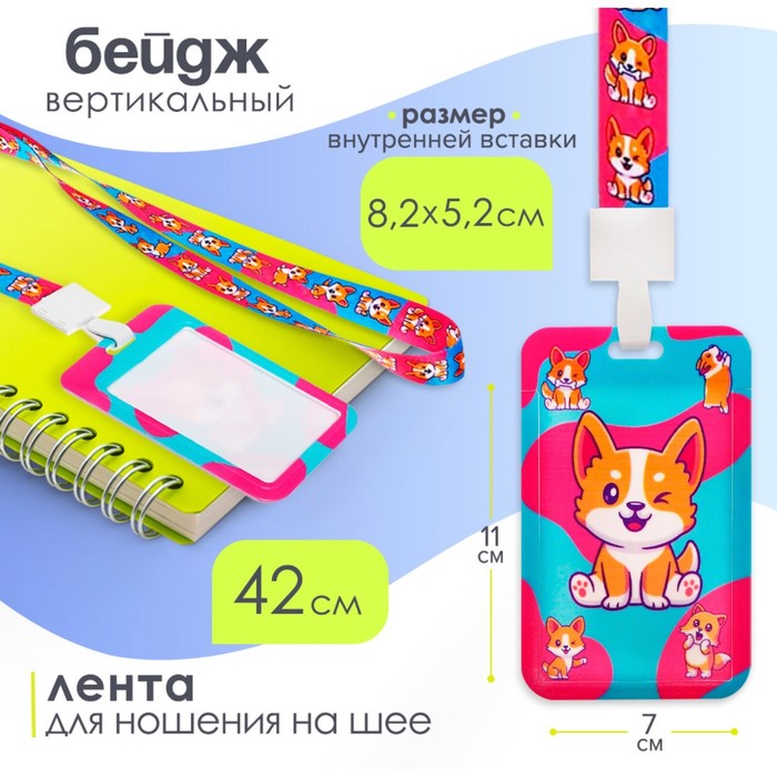 Бейдж вертикальный «Корги», внешний размер 11×7 см, внутренний размер 8.2×5.2 см, лента 42 см
