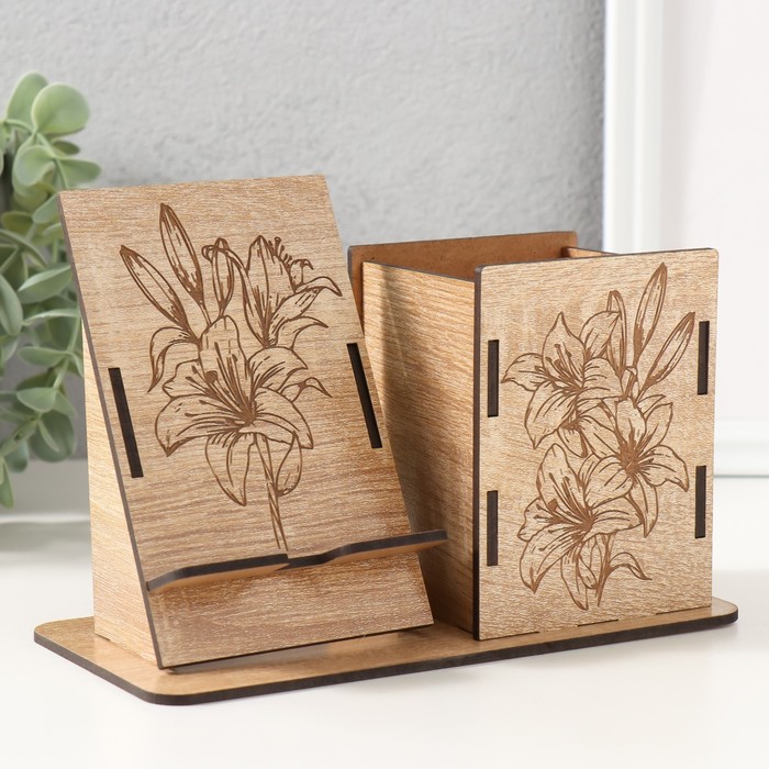Деревянный органайзер настольный для канцелярии «Лилии», набор 9 деталей, с подставкой под телефон, карандашница, 18×12.5×9 см