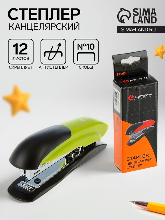 Степлер канцелярский № 10, Lamark Ulrich, до 12 листов, встроенный антистеплер, зелёный