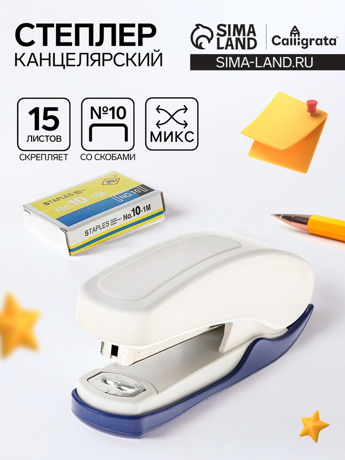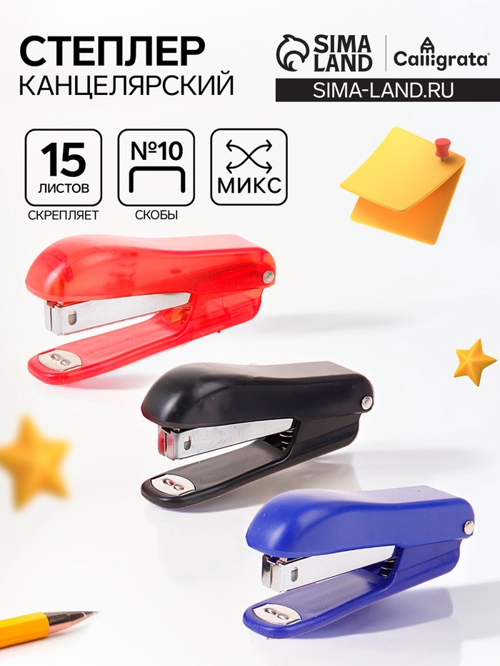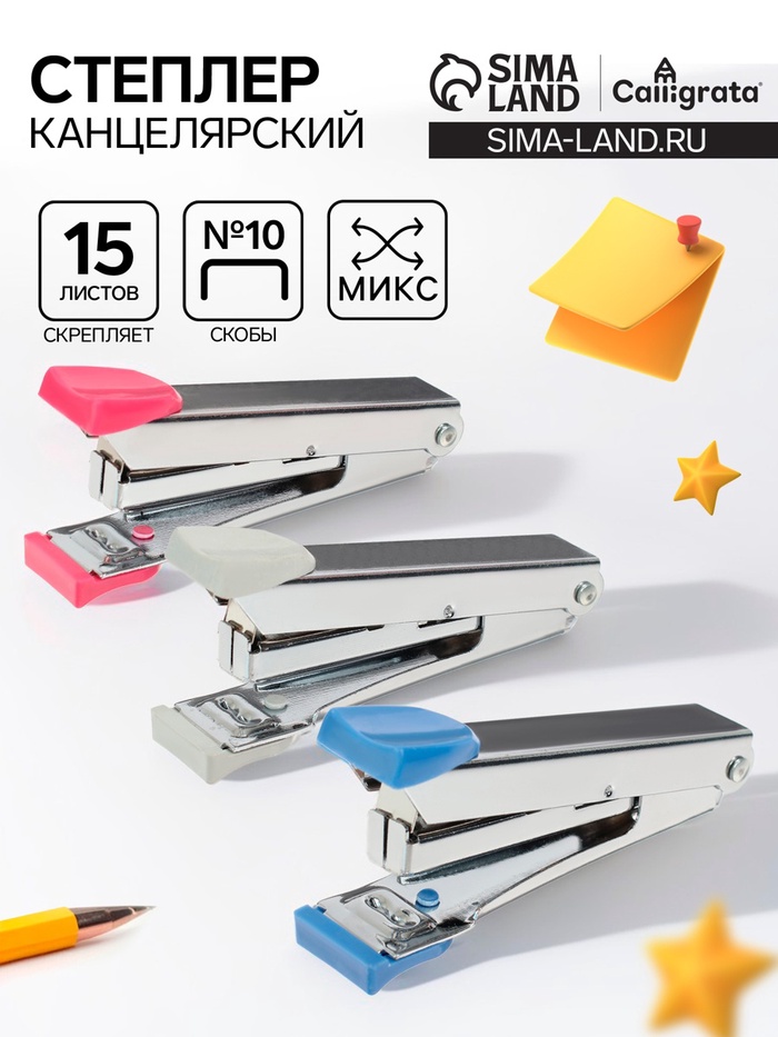 Степлер канцелярский №10, Calligrata, до 15 листов, со скобами, блистер, МИКС