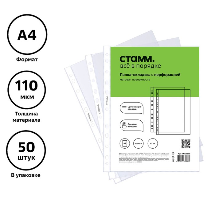 Файл-вкладыш А4, 110 мкм, СТАММ, матовый, вертикальный, 50 штук