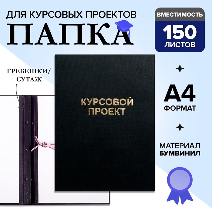Папка "Курсовая работа" А4, бумвинил, гребешки/сутаж, без бумаги, цвет чёрный (вместимость до 150 листов)