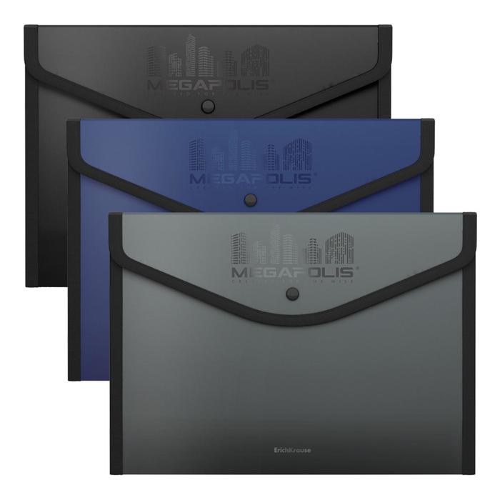 Папка-конверт на кнопке А4, 600 мкм, ErichKrause Megapolis, обшитая, непрозрачная, микс