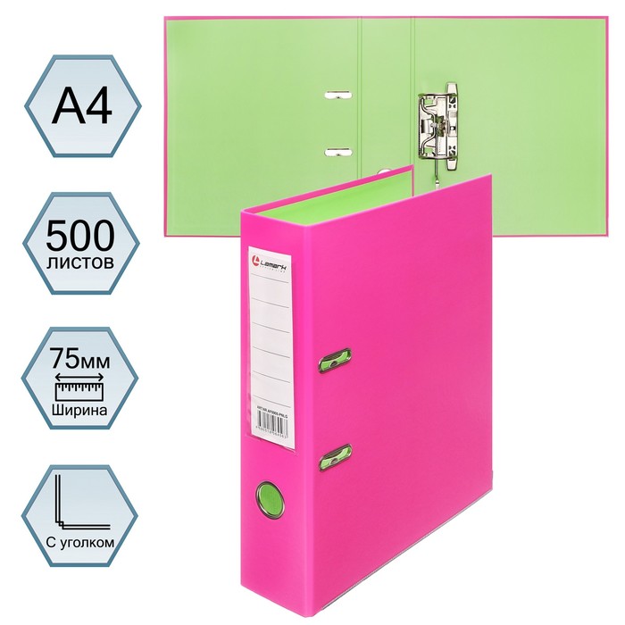 Папка-регистратор А4, 75 мм, Lamark, ПВХ, двухстороннее покрытие, металлическая окантовка, карман на корешок, собранная, розовый/зелёный