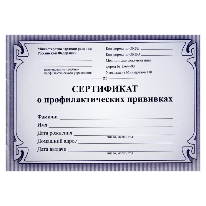 Сертификат о профилактических прививках А6 12 листов, обложка мелованный картон 215 г/м², блок - бумага писчая 60 г/м². Форма № 156/у-93