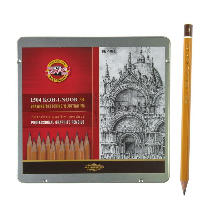 Набор карандашей чернографитных разной твердости 24 штуки Koh-i-Noor 1504 ART, 8В-10Н, в металлическом пенале