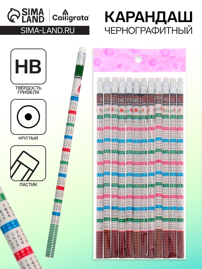Карандаш чёрнографитный Calligrata «Таблица умножения», НВ, незаточенный, с ластиком, круглый, деревянный