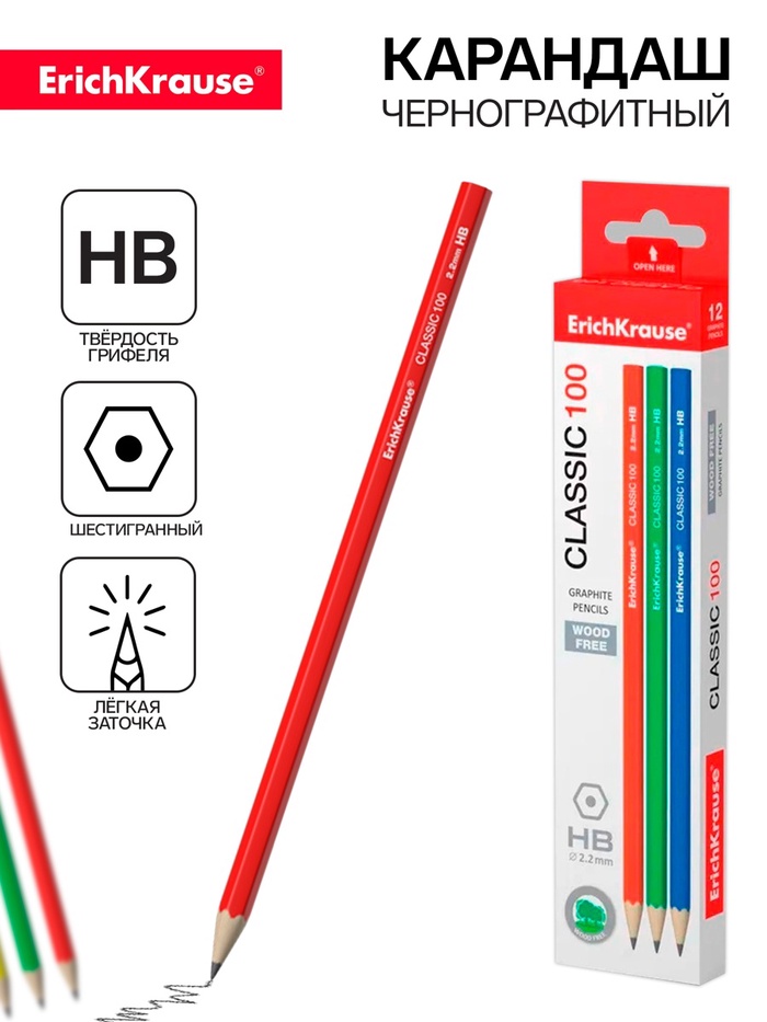 Карандаш чернографитный ErichKrause "Classic 100", HB, грифель d=2.2 мм, пластик, шестигранный, в коробке, микс