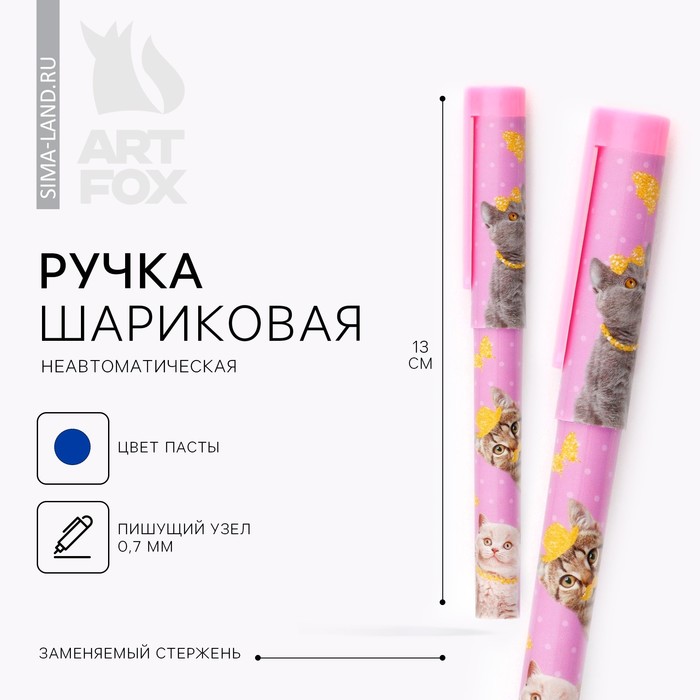 Ручка шариковая синяя паста 0.7 мм с колпачком «Котики» пластик