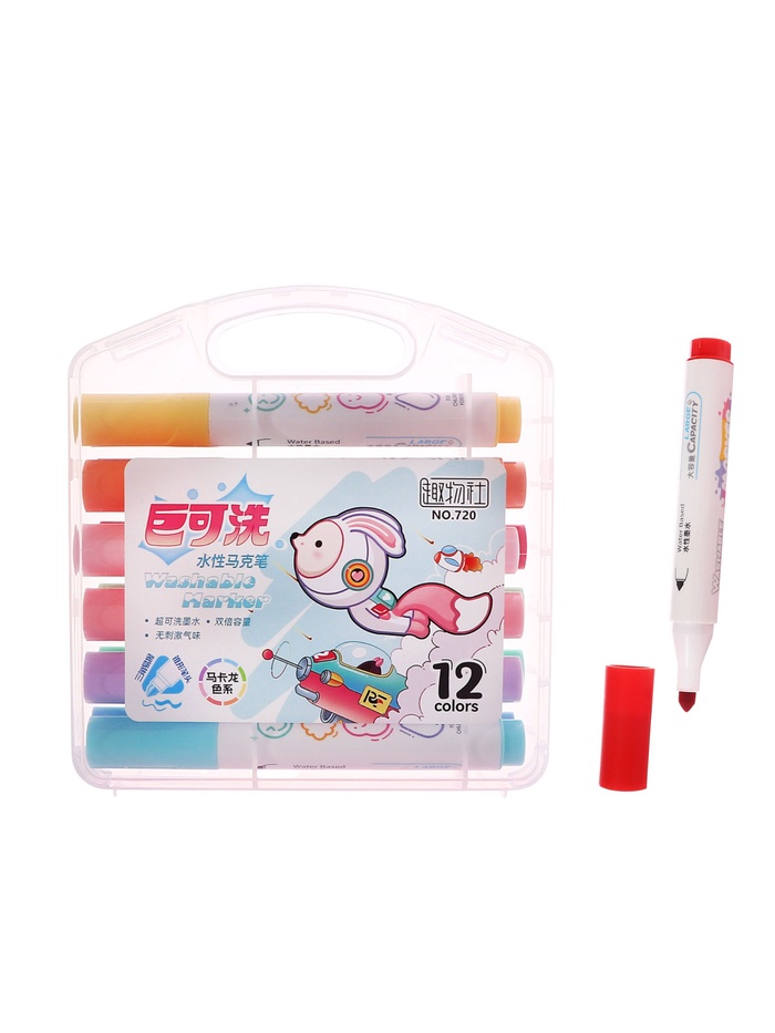 Фломастеры 12 цветов в пластиковом пенала, смываемые водой