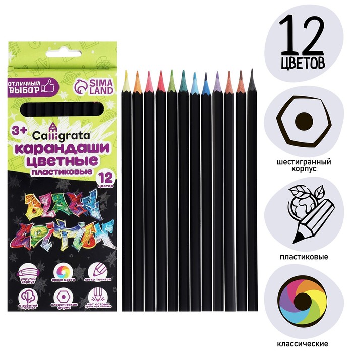 Карандаши цветные 12 цветов Calligrata, «Чёрная серия» заточенные, шестигранные, пластиковые, картонная упаковка, европодвес