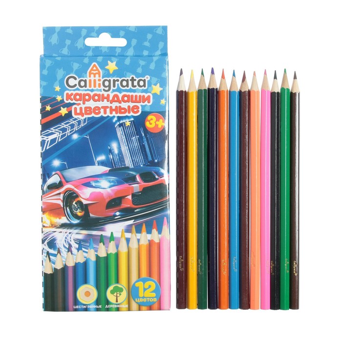 Карандаши цветные 12 цветов, «Машинка», корпус деревянный, шестигранный