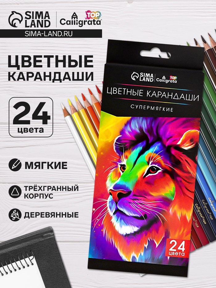 Карандаши цветные 24 цвета TOP Calligrata, супермягкие, в картонной коробке, диаметр грифеля 3 мм, 5B