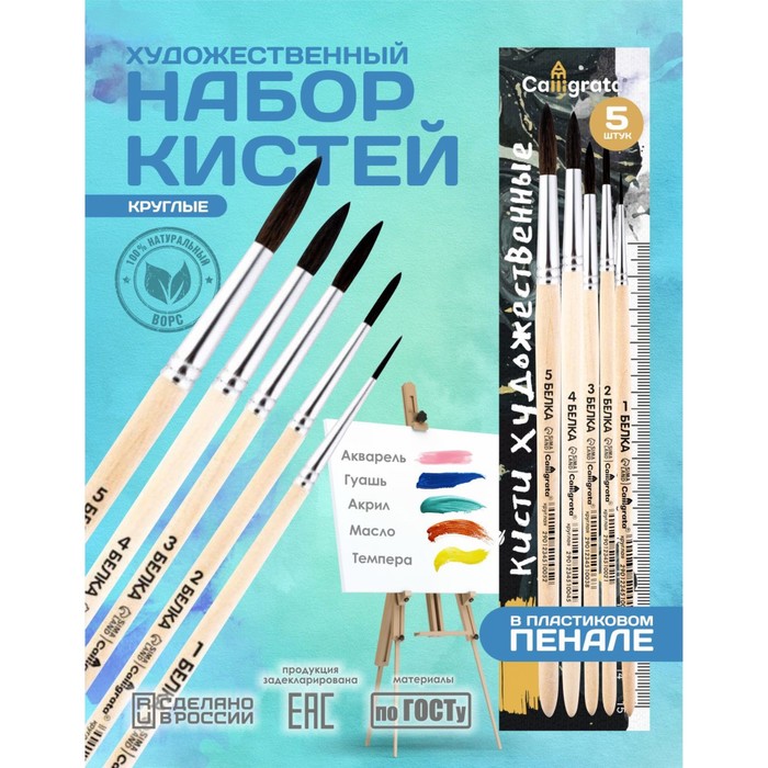 Набор кистей Белка 5 штук, Calligrata №4 (круглые №: 1, 2, 3, 4, 5), деревянная ручка, в пенале