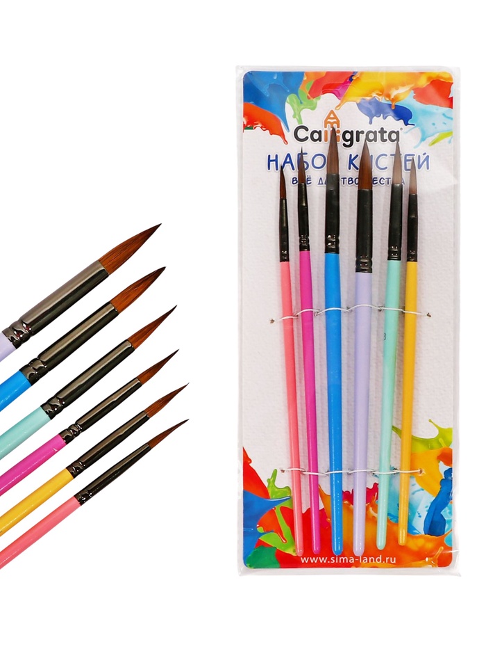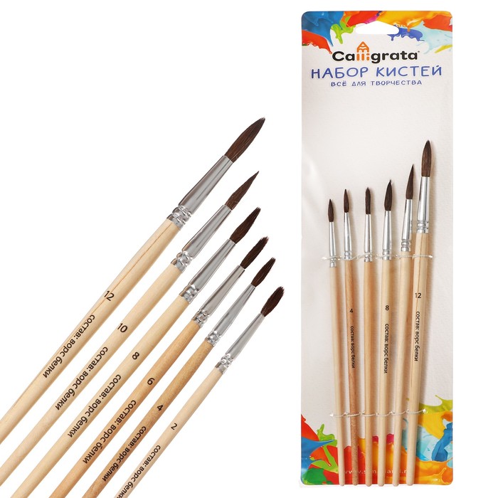 Набор кистей белка, Calligrata, круглые, 6 штук (№2,4,6,8,10,12) с деревянными ручками, в блистере