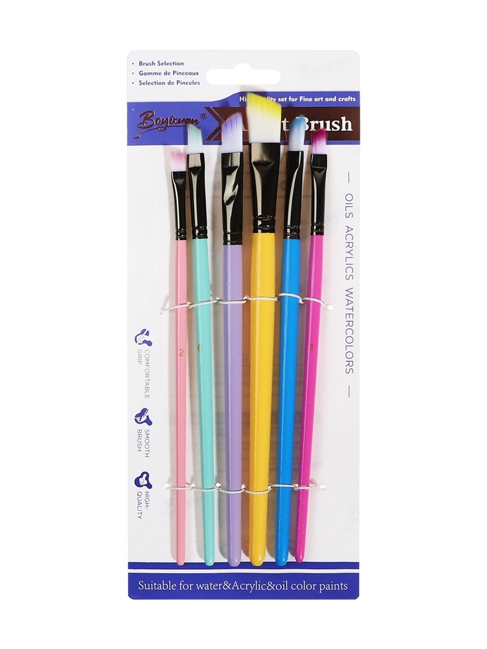 Набор кистей синтетика (№2,4,6,8,10,12), плоские, с цветными ручками, скошенные, 6 штук