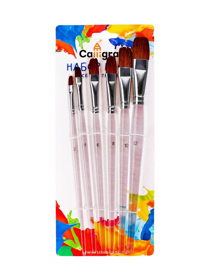 Набор кистей пони-синтетика, плоские, 6 штук, с прозрачными ручками (№2.4,6.8,10.12)