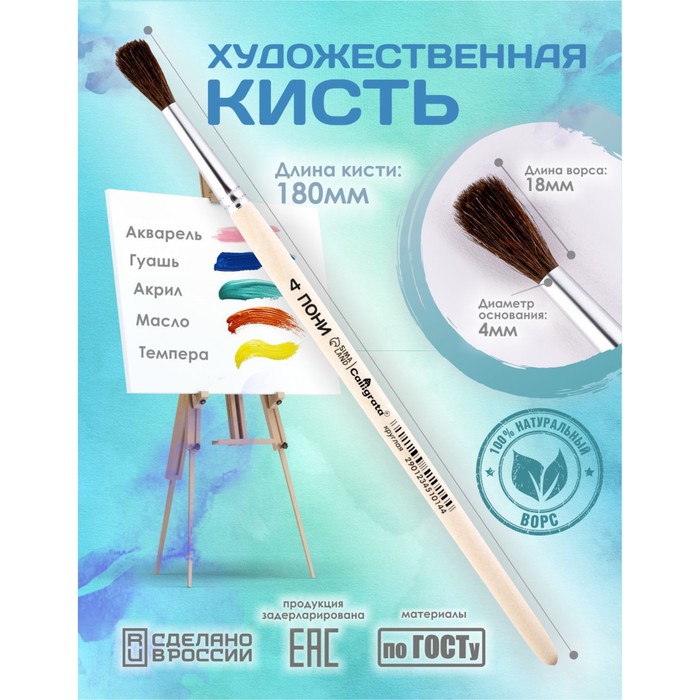 Кисть для рисования, Пони круглая № 4 (диаметр обоймы 4 мм; длина волоса 18 мм), деревянная ручка, Calligrata