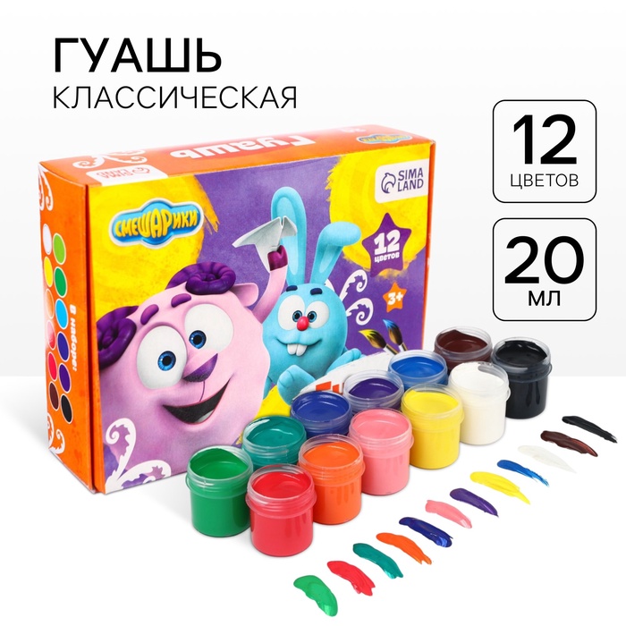 Гуашь 12 цветов по 20 мл, «Смешарики», карамельная
