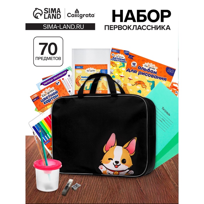 Набор первоклассника, 70 предметов, Calligrata «Корги», с пособиями, в папке