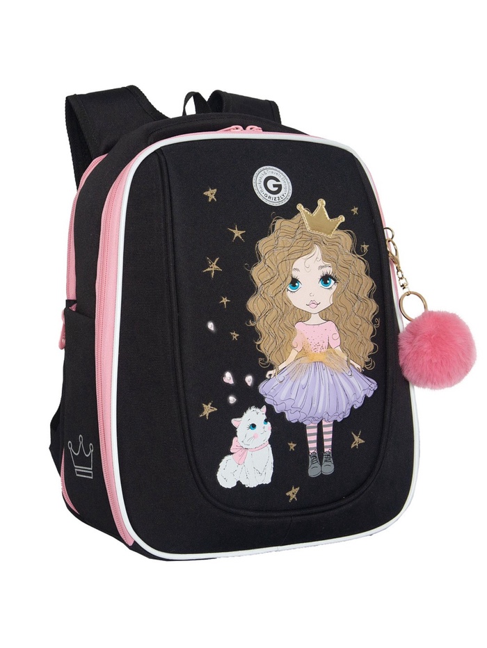 Рюкзак школьный Grizzly, 36×29×18 см, каркасный, брелок, чёрный, RAf-592