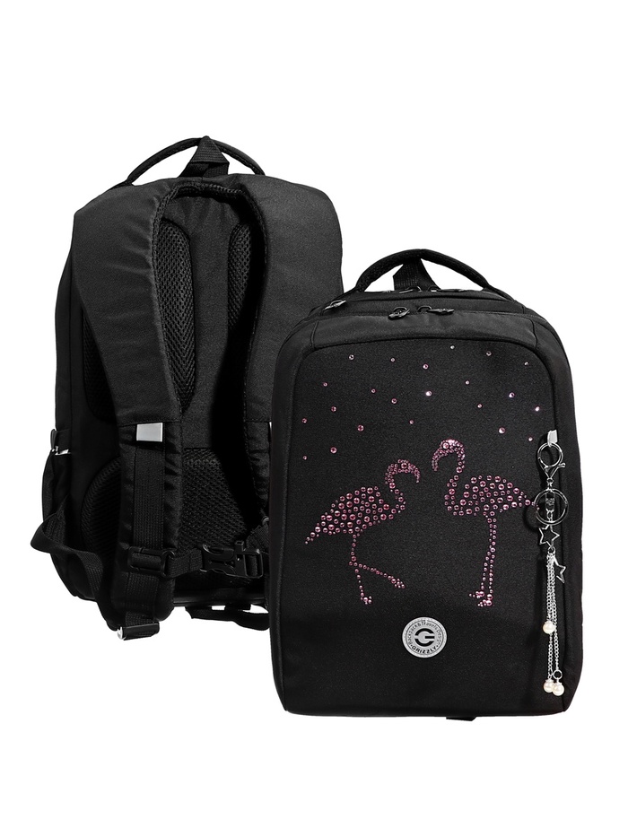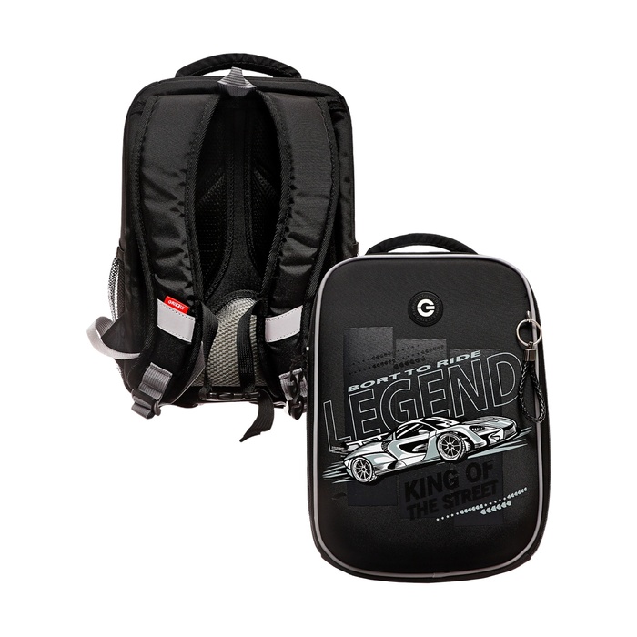 Ранец каркасный Grizzly, 37×26×16 см, брелок, чёрный/серый