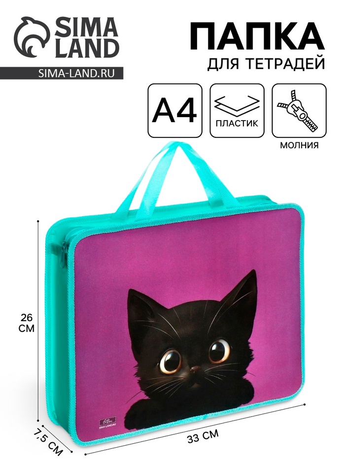 Папка с ручками А4, 330×260×75 мм, пластиковая, ручки-тесьма, «Котик черный» МИКС