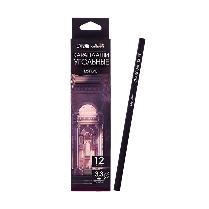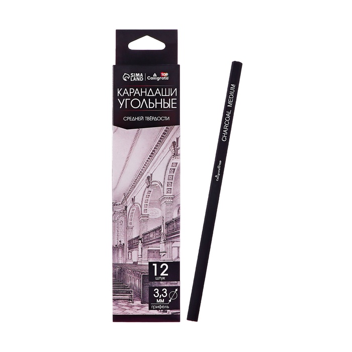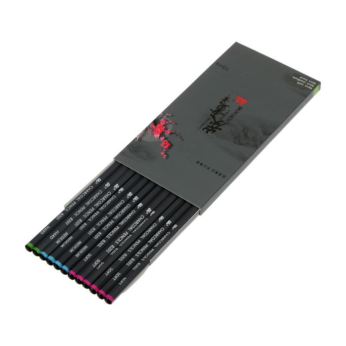 Карандаши угольные чёрные 12 шт. в наборе (мягкие 6 шт., средние 4 шт., твёрдые 2 шт.)