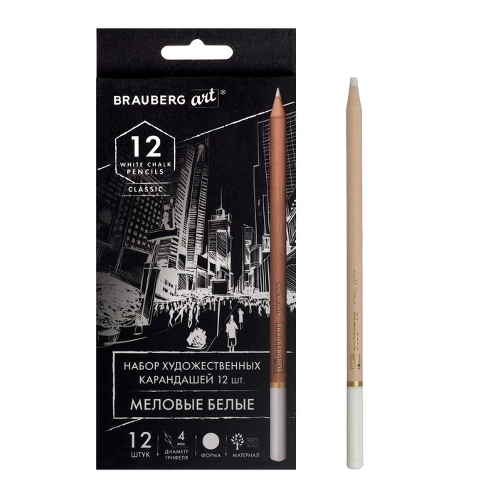 Карандаши МЕЛОВЫЕ художественные белые, НАБОР 12 штук, BRAUBERG ART CLASSIC, грифель 4 мм, 181897