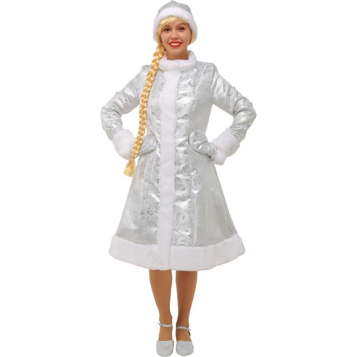 Костюм карнавальный «Снегурочка», шубка из парчи, шапочка, рукавички, серебристый, р. 52